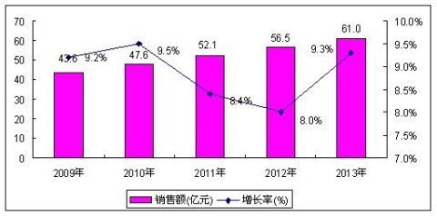 圖6 2009-2013年中國通信電源市場銷售額預測
