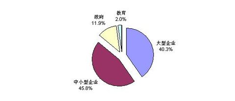 根據(jù)以上垂直市場(chǎng)的定義,2008年中國(guó)穩(wěn)壓電源市場(chǎng)中,中小型企業(yè)占據(jù)了市場(chǎng)的首要位置,市場(chǎng)份額占據(jù)整個(gè)市場(chǎng)的45.8%;大型企業(yè)與政府市場(chǎng)分別占有40.3%和11.9%的市場(chǎng)份額;教育所占份額較低,只有2.0%的市場(chǎng)份額。