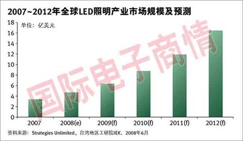 至2012年全球LED照明市場預計將達16億美元,2007~2012年復合增長率為37%。
