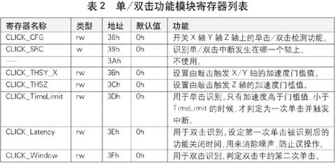 在檢測出第一次單擊的基礎上,第二次單擊的識別必須滿足CLICK_Latency和CLICK_Windows設定的條件。只有第二次單擊落在CLICK_Windows時間段內,才是一次有效的雙擊,否則只能判定為兩次單擊。CLICK_Latency是用來設定第一次單擊被識別后的功能關閉時間的,它用來消除噪聲加速度,防止誤觸發。