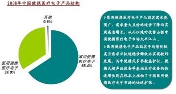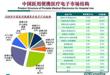 他的研究發現,在便攜式醫療電子市場中,家用電子市場達到65.4%的份額,而且市場呈現加速增長的態勢,2008年市場的增長速度達到28%!該市場中的電子血壓計、便攜式血糖儀和電子助聽器占據了90%以上的銷售份額。由于目前市場普及率還不高,加之中國人口基數比較大,所以他認為家用便攜式醫療電子產品前景非常好。
