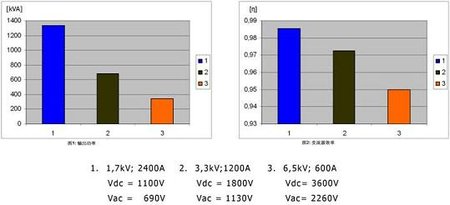 結(jié)果顯示,采用3.3 kV、1200 A獨(dú)立模塊得到的最大功率約為采用1.7 kV、2400 A IGBT所得功率的一半。相比之下,6.5 kV、600 A IGBT模塊所提供的功率僅為1.7 kV IGBT的四分之一。產(chǎn)生這一結(jié)果的原因是IGBT模塊的損耗。如果計(jì)算圖2中三個變換器的效率,可以看到損耗比為1:2:4。