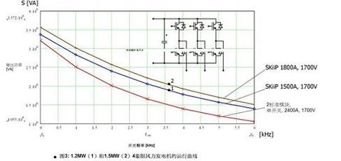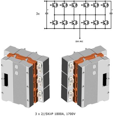 如果采用了更強(qiáng)大的SKiiP模塊,如使用氮化鋁作為陶瓷基板的SKiiP 1.8kA, 1.7kV,可從三相逆變器獲得更高的功率,即1800 kVA。