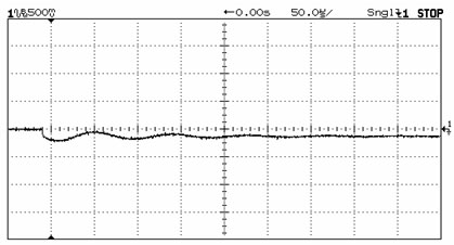 以下是系統所采用的模塊,負載從25%到75%的階越響應曲線,從該曲線可以看出,輸出電壓根本就沒有沖出穩態誤差帶,即動態響應時間為0,這是由于該模塊采用了特殊的控制結構,應該說不可能再有其他電源會超越這一結果了。下圖中,縱向每格為500mV,橫向時每格為50uS。