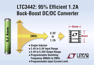 凌特公司(Linear Technology)推出真正降壓-升壓 DC/DC 轉換器 LTC3442。該器件可在 95% 的效率提供高達 1.2A 的連續輸出電流。LTC3442 是一個同步和固定頻率的降壓-升壓 DC/DC 轉換器,可用于由單節鋰離子電池、多節堿性電池或鎳氫金屬電池供電等應用,并延長了電池的使用壽命。其輸入電壓范圍為 2.4V 至 5.5V,能提供 2.4V 至 5.25V 的固定輸出電壓。