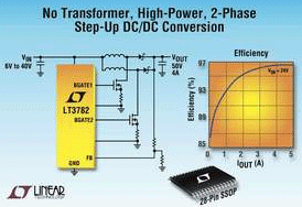 LT3782可用10V至36V的輸入電源,并以高達96%的效率在4A負載電流的情況下提供50V穩壓輸出。在10V柵極驅動電壓和4A峰值驅動電流時,LT3782能以高效率驅動工業級大功率MOSFET。此外,通過可調的斜率補償、時延和欠壓閉鎖以及同步工作和時鐘同步,電源設計師能夠定制電路以獲得最佳性能。