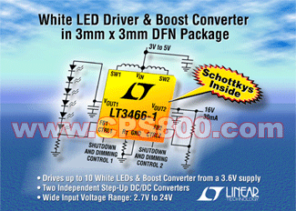 10月20日北京訊,凌特公司(Linear Technology Corporation)推出雙升壓型 DC/DC 轉換器 LT3466-1,它是采用扁平 3mm x 3mm DFN 封裝的白光 LED 驅動器和升壓型轉換器。其 LED 驅動器通道可從單節鋰離子電池輸入并以高達 83% 的效率驅動多達 10 個白光 LED。而其升壓型轉換器可以產生 TFT-LCD 偏置電壓或驅動一個 OLED 顯示器。每個通道都有獨立的調光和停機控制。該器件集成了肖特基二極管,節省了因使用外部二極管而增加的成本和所需的電路板空間。其 3mm x 3mm DFN 封裝和纖巧外部組件可為空間受限的手持應用提供一個占板面積非常緊湊的解決方案。