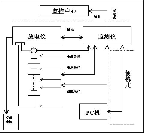 將容測儀的直流輸入部分的正負接線連接到蓄電池的正負極上,交流部分的接線則連接在相應的交流電源上。監測儀按照順序將接線夾子固定在每個蓄電池上。隨后將監測儀的通信口分別與計算機和放電儀連接,構成如圖的結構。這樣就是便攜式的基本連接方法。然后通過對計算機的操作舊可以讓這個系統工作,并且記錄相關數據,由計算機得出每只蓄電池的剩余容量。