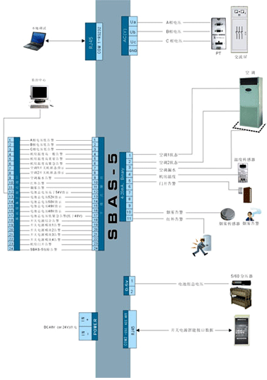 SBAS-5具有干接點輸出接口,它將各種被監測量轉變為開關量信號,輸出到被監控局站設備的干接點信號采集接口,傳輸到監控中心。它用來向中心傳遞基站的告警信號或者某些狀態信號。它配備13個通用接口(其中2個是0~5V接口),可以實現對各種模擬量和開關量的采集。可以接入1臺智能設備(如開關電源)。通過設置將采集到的智能非智能數據轉變為二進制開關量信號,輸出到24路干接點接口。