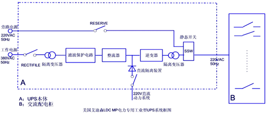 包括: 輸入隔離變壓器、輸出隔離變壓器、整流器、逆變器、靜態(tài)旁路開(kāi)關(guān)、手動(dòng)維修開(kāi)關(guān)、直流隔離二極管、控制單元、顯示單元等