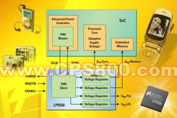 只要采用美國國家半導體的LP5550芯片,便可按照數字處理器的實際需要將供電電壓調至最低,這樣可大幅減少處理器的功耗。LP5550芯片內置一個專為處理器核心提供可適性供電電壓的降壓穩壓器以及另外三個固定電壓穩壓器。這三個固定電壓穩壓器可為低功耗單芯片系統的輸入/輸出環、振蕩器/鎖相環路以及存儲器提供供電。PWI接口可以控制這款LP5550芯片的功能,讓數字處理器可以輕易與LP5550芯片保持聯系。