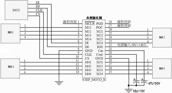 儀表用步進電機驅動專用模塊是由一個單片機(PIC16F630)和4組步進電機驅動片組成一個共有28PIN引腳的專用模塊。它通過SPI總線結構的通訊接口,從主控單片機接受電機控制的信號(電機的目標位置)和設定數據(電機的轉速,初始位置),而后自行產生所有電機的驅動脈沖和控制信號。該模塊可以極大程度減少儀表系統中主控芯片資源在驅動儀表電機上的負擔,從而更好的做到系統的優化。