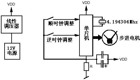 本方案汽車指針時(shí)鐘表由單片機(jī)控制步進(jìn)電機(jī)驅(qū)動(dòng)時(shí)針和分針指示時(shí)間,電源由車上12V供電。單片機(jī)選用美國(guó)MICROCHIP公司的PIC16F630芯片,晶振頻率為4.194304Mhz,精度為10ppm,步進(jìn)電機(jī)選用SWITEC公司的X16.123。