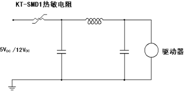 如圖所示,本公司提供的KT-SMDⅠ系列表面貼裝型熱敏電阻(1812)可以串聯在電路中,對各種驅動設備提供有效的異常保護。