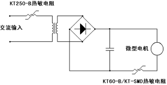 熱敏電阻通常被至于線圈的附近,這樣熱敏電阻更易于感受溫度,使保護更加迅速有效。用于初級保護的熱敏電阻通常選用耐壓等級較高的KT250 型熱敏電阻,用于次級保護的熱敏電阻通常選用耐壓等級較低的KT60-B、KT30-B、KT16-B 及片狀電機專用系列產品。