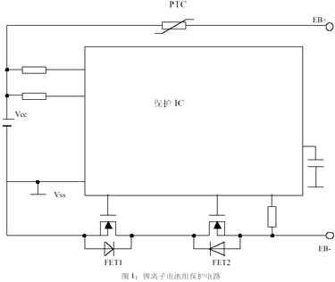 手機(jī)電池通常采用由電池保護(hù)專用集成IC 和金屬氧化物場(chǎng)效應(yīng)管組成的一次保護(hù)電路。保護(hù)IC 通過監(jiān)測(cè)電池兩端電壓以及放電電流來控制FET 的導(dǎo)通或關(guān)斷,防止過充電、短路、過放電等故障。