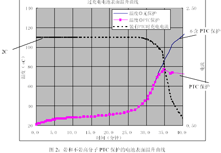 從上面的試驗(yàn)結(jié)果能夠觀察到,不帶PTC 保護(hù)的電池在過充電時(shí)表面溫度最高可達(dá)到接近120℃,最終會(huì)漏液或起火、爆炸;而裝有科特公司KT16-1750DL 型高分子PTC 的電池其表面溫度不會(huì)超過80°C。