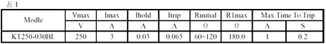 我們通過(guò)舉例來(lái)對(duì)PPTC 熱敏電阻的作用進(jìn)行說(shuō)明。例如,被保護(hù)的變壓器規(guī)格是AC220V/2W,在次極短路的極限條件下,要求用PPTC 進(jìn)行保護(hù)。根據(jù)對(duì)眾多廠家該型號(hào)變壓器的研究,我們使用KT250-030BL 這種型號(hào)的PPTC 熱敏電阻。該型號(hào)PPTC 熱敏電阻工作的環(huán)境溫度為-40~+85℃,開(kāi)關(guān)溫度100℃,最大表面溫度130℃。主要性能參數(shù)見(jiàn)表1 和圖2、圖3。