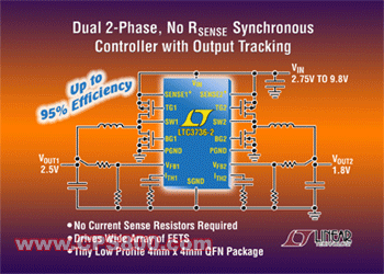 凌特公司(Linear Technology Corporation)推出具有輸出跟蹤功能的兩相雙輸出同步降壓型開關穩壓控制器 LTC3736-2,它能驅動多種外部功率 MOSFET。該器件 2.75V 至 9.8V 的輸入范圍使其能夠用單節鋰離子電池、多節鎳鎘/鎳氫電池和固定 5V 輸入等多種輸入工作。它能提供低至 0.6V 的輸出。LTC3736-2 的恒定頻率電流模式架構和 MOSFET VDS 檢測功能免除了檢測電阻的需要,同時提高了效率。通過讓兩個控制器不同相工作,最大限度地降低了由輸入電容的 ESR 所引起的功率損耗和噪聲。