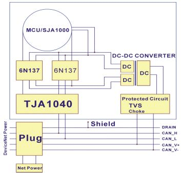 鑒于此種情況,我們對現有電源產品進行深入研究,發現其主要問題是:產品尺寸大、啟動電流大、低壓失控、輸出精度低等問題。針對這一系列問題,MORNSUN公司不斷努力,對模塊電源從電路設計、制造工藝,到檢測等項目進行全線創新,現推出了1W、3W、5W、10W等不同功率的寬電壓模塊電源,其輸入電壓有5(4.5~9)VDC、12(9~18)VDC、24(18~36)VDC、48(36~72)VDC四種,輸入電壓變化范圍達2:1,轉換效率高達85-89%,并且滿足工業級-40~~+85℃的工作條件下滿負載長期工作,可抑制電磁干擾和消除接地環路,保護系統電路免受外部網絡影響,同時可以降低功耗,簡化電路。其具體應用如圖1所示,