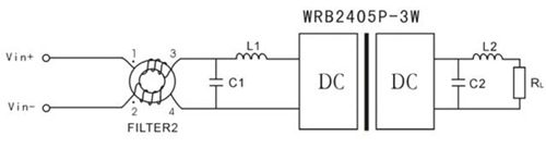 電路中的一些共模干擾,我們可以考慮在模塊的輸入端采用共模扼流圈FILTER2進行抑制(MORNSUN公司有此配套產品),如圖2所示。