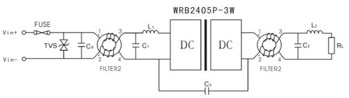 輸入端有時還存在有高電壓脈沖沖擊的可能,以及對干擾較強或EMC要求較嚴格的電路,應考慮在輸入端加上自恢復FUSE及TVS管進行一級防護,使得有效地將過高的脈沖干擾電壓鉗制在模塊可承受值范圍之內,并在輸出端也增加共模扼流圈FILTER2或安規電容。如圖3示: