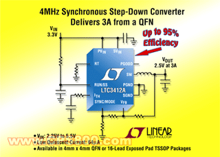 凌特公司(Linear Technology Corporation)推出采用恒定頻率、電流模式架構的高效率 4MHz 同步降壓型穩壓器 LTC3412A。它采用 4mm x 4mm QFN(或耐熱增強型 TSSOP-16)封裝,在電壓低至 0.8V 時可提供高達 3A 的持續輸出電流。輸入電壓范圍為 2.25V 至 5.5V,非常適用于單節鋰離子或鎳氫金屬電池應用以及更通用的固定軌系統。其 4MHz 的開關頻率允許利用高度低于 1.5mm 的纖巧低成本電容器和電感器。高頻工作還保持開關噪聲在關鍵無線和 xDSL 頻率范圍之外,使其成為 xDSL 調制解調器、蜂窩基站和汽車應用的理想選擇。
