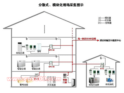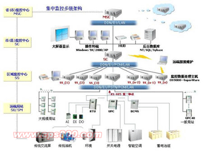 將被監控設備分為傳統設備、智能設備、蓄電池組三大類,并采用不同的專業模塊(RTU/UPC40/BCMS)采集數據形成統一協議,透過E1/DDN/PSTN/LAN等傳輸方式匯接至區域監控中心SS(Supervision Station)。有統一通信協議的“多功能電表”和“智能門禁系統”使監控管理功能更加全面。