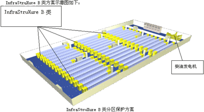 InfraStruXure B類輸出功率為10-40KVA,三進三出,UPS主機采用Symmetra PX,是目前UPS業界最先進和全面集單機冗余、熱插拔、遠程管理和機房環境匹配的UPS主機,同時電池的配置也利用模塊化,用戶可以非常便捷的進行功率容量、后備時間的變化,同時主控模塊也是雙備份運行,模塊之間互相熱備份,而且支持主機的自診斷,熱插拔,通過主機前部的顯示面板用戶可以非常方便的對整個系統進行管理和狀態查詢,同時可以在系統內部任何模塊出現問題時不中斷輸出的情況下熱更換故障模塊,達到不停機運行和維護的功能,適用于50—500m2的中大型數據中心, 在這樣的應用環境下,APC公司推出業界獨有的區域保護解決方案,用戶可以將數據中心中的IT設備按照使用的具體情況,如可用性級別的高低劃分不同區域,同時采用B類InfraStruXure™系統完成不同可用性級別的區分和保護,用戶還可以在集中供電保護方案中單獨為幾排重要機柜負載配置B類InfraStruXure系統達到更高可用性。