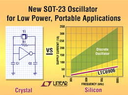 凌特公司(Linear Technology)推出在 100kHz 時具有 18uA 超低工作電流的 LTC6906 可編程硅振蕩器。LTC6906 是便攜式設(shè)備的理想時鐘芯片,其占板面積僅為 LTC6906 ThinSOTTM 封裝和一個電阻所占面積。這些振蕩器無需旁路電容,可以編程至介于 10kHz 至 1MHz 之間的任何頻率。