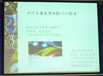 李先生繼續(xù)為大家講到:“每路輸出不得超過240VA的限制,也就是說,+12V的峰值不得超過20A。更高的+12V輸出能力,是通過多路+12V輸出來實(shí)現(xiàn)的,并對(duì)每路進(jìn)行獨(dú)立的過流保護(hù)。”這兩點(diǎn)可是2.0規(guī)范最重要的特征哦!