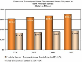 許多技術(shù)被用于距離與線性位移傳感器。VDC預(yù)測(cè),其中光學(xué)類型器件的增長速度將是最快的。預(yù)計(jì)到2007年北美光電距離傳感器市場的復(fù)合年增率為6.1%。光電距離傳感器采用幾種不同的光源。其中,北美市場出貨量增長最快的預(yù)計(jì)是紅外和激光產(chǎn)品。紅外傳感器能有效率地產(chǎn)生強(qiáng)光束,適合于長距離傳感。