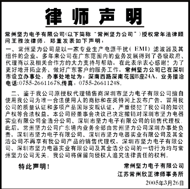 本文鏈接:常州堅力電子有限公司律師聲明(圖)