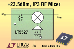 凌特公司(Linear Technology)新的高線性度有源下變頻 RF 混頻器極大地降低 3G 蜂窩基站的成本并簡化其設計。LT5527 RF 混頻器具有延至 3.7GHz 的工作頻率范圍。在 1.9GHz 時,LT5527 具有 23.5dBm 的 IIP3(輸入 3 階截取)線性度、2.3dB 轉換增益和 12.5dB 噪聲指標,從而滿足了 3G 蜂窩基站和其它高性能無線基礎設施接收器的動態范圍要求。LT5527 的本機振蕩器(LO)和 RF 輸入以單端方式工作,具有內置 50W 阻抗,只需要很少的外部匹配器件,同時可降低基站成本和縮短設計時間。此外,LT5527 包含一個低噪聲 LO 緩沖器,允許工作于 -3dBm LO 驅動功率,解決了 RF 隔離難題并減少了外部濾波需求。