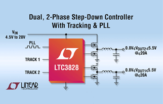 凌特公司(Linear Technology)推出雙輸出降壓型同步開關控制器 LTC3828,該器件具有用于多電壓軌排序的集成跟蹤功能以及用于精確同步和多相(PolyPhase®)工作以降低輸入電容的鎖相環(PLL)。LTC3828 具有獨特的能力,能以菊花鏈方式鏈接多個 LTC3828 或其它 DC/DC 轉換器,以跟蹤兩個以上的電壓,同時工作在 3、4 或 6 相。該集成電路具有恒定的 550kHz 頻率電流模式架構,還能鎖定到 260kHz 至 550kHz 的時鐘上以降低敏感頻率上的 EMI。