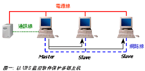 (1) 一是在每一部主機(jī)上安裝監(jiān)控軟件,直接與UPS聯(lián)機(jī)的計(jì)算機(jī)設(shè)為Master,其余的設(shè)為Slave (圖一)。當(dāng)Master偵測(cè)到UPS有任何異常電力事件時(shí),它會(huì)通知Slave主機(jī)。然后各監(jiān)控軟件依照自己設(shè)定的時(shí)間進(jìn)行關(guān)機(jī)程序最后再關(guān)閉UPS。
