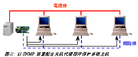 (2) 另一種方式是在UPS加裝SNMP網(wǎng)絡(luò)卡,而在各主機(jī)安裝關(guān)機(jī)代理程序 (圖二)。當(dāng)市電中斷時(shí)SNMP網(wǎng)絡(luò)卡會(huì)主動(dòng)送出Trap給關(guān)機(jī)代理程序,關(guān)機(jī)代理程序在收到通知后會(huì)進(jìn)行倒數(shù)關(guān)機(jī)程序。采用SNMP網(wǎng)絡(luò)卡的好處是它不需透過(guò)計(jì)算機(jī)可直接上網(wǎng),適用于UPS與主機(jī)距離較遠(yuǎn)的情況。