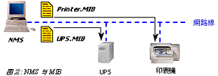 為了能有效管理網(wǎng)絡(luò)上眾多的設(shè)備,如服務(wù)器、集線器等通訊設(shè)備,或打印機(jī)、UPS等外圍設(shè)備,管理者會(huì)架設(shè)一部NMS(Network Management Station) 讓各裝置也就是SNMP Agent將資料響應(yīng)給NMS。由于各裝置的制造廠商皆不相同,故需有一套共同的語(yǔ)言讓NMS與各裝置交談,這個(gè)語(yǔ)言也就是網(wǎng)絡(luò)上所謂的通訊協(xié)議,而目前應(yīng)用于網(wǎng)管通訊協(xié)議最普遍的就是SNMP(簡(jiǎn)單網(wǎng)絡(luò)管理通訊協(xié)議)。雖有了共同的語(yǔ)言但這些裝置仍需提供此裝置可被監(jiān)控的對(duì)象描述,也就是MIB(管理信息庫(kù))給NMS。根據(jù)MIB,NMS才能對(duì)此裝置做出正確的詢問(wèn)并下達(dá)正確的命令 (圖三)。雖然RFC1628規(guī)范了一般UPS的MIB但仍不能滿足現(xiàn)有網(wǎng)絡(luò)UPS的需求,故各大UPS廠商仍然自定其私有的MIB來(lái)發(fā)揮自己UPS的特殊功能。