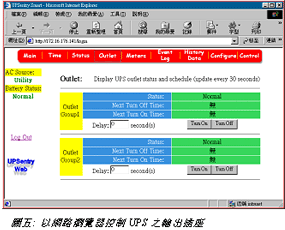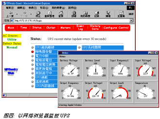 另一項(xiàng)網(wǎng)絡(luò)UPS的特殊功能則是遠(yuǎn)程監(jiān)控。由于目前網(wǎng)際網(wǎng)絡(luò)的盛行,幾乎每部計(jì)算機(jī)皆配備網(wǎng)絡(luò)瀏覽器,近來(lái)許多Linux業(yè)者采用網(wǎng)絡(luò)瀏覽器來(lái)作為系統(tǒng)設(shè)定與監(jiān)控的接口。一些UPS大廠亦看準(zhǔn)此一趨勢(shì)紛紛將HTTP通訊協(xié)議加入其監(jiān)控軟件與SNMP卡之中 (圖四)。它的好處是在遠(yuǎn)程無(wú)須加裝任何程序,管理者隨時(shí)隨地皆可以網(wǎng)絡(luò)瀏覽器得知UPS的最新?tīng)顟B(tài)。