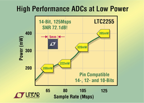 6月15日北京訊,凌特公司(Linear Technology)推出具有卓越 AC性能和極低功率的 125Msps、14 位模數(shù)轉(zhuǎn)換器(ADC)LTC2255。LTC2255 的性能優(yōu)于最接近的 14 位同類產(chǎn)品,消耗功率低 49%,僅為 395mW,從而極大地減少了多通道器件所需的功率預(yù)算和熱量考慮因素。這在效率和冷卻是關(guān)鍵要素的應(yīng)用中具有極大的優(yōu)勢(shì),例如在衛(wèi)星接收器、無(wú)線基站和便攜式電子產(chǎn)品。作為款型眾多的引腳兼容型系列的一部分,LTC2255 采用具有集成旁路電容器的小型實(shí)用 5mm x 5mm QFN 封裝,因此僅需要很少量的纖巧外部元件。LTC2255 無(wú)需大和昂貴的去耦電容器,所以可提供尺寸最小的可用解決方案,這減輕了 PCB 空間受限問(wèn)題并允許更緊湊和具經(jīng)濟(jì)效益的設(shè)計(jì)。由于 LTC2255 尺寸小,功率低及所需外部元件少,所以在只能裝入一個(gè)同類競(jìng)爭(zhēng)解決方案的占板面積內(nèi),設(shè)計(jì)師能夠輕而易舉地裝進(jìn)四片 LTC2255 ADC。