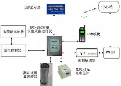 系統由JWZ-1MG雨量水位采集遠傳儀、雨量傳感器、JLWL-3光電水位計、LED水情顯示屏、太陽能電池板及充電控制器等組成。