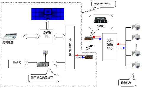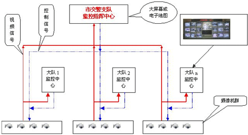 整個系統包括支隊和大隊兩極控制中心,從訪問權限看,支隊高于大隊,但從對前端攝像機的控制和信號采集來看,二者級別相同,這種設置完全符合公安交警的實際情況。實現方法就是兩級監控中心具有獨立的交換矩陣和控制設備,支持相同協議,并且有各自的大屏幕監視系統。
