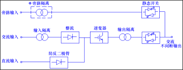 我公司藍堡系列UPS根據電力行業的特點,充分考慮其負載特點而開發設計的,其電路結構圖如下所示: