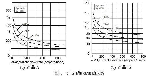 從圖中可見,隨著二極管的正向電流If的增加反向恢復時間trr隨著增加;di/dt的增加,反向恢復時間trr減小。因此,以測試小信號開關二極管的測試條件IF=IR=10ma為測試條件的反向恢復時間不能如實表現實際應用情況;以固定正向電流(如1A)為測試條件也不能在實際應用中得到客觀再現;不同電流檔次以其額定正向電流或其1/2為測試條件則相對客觀。
