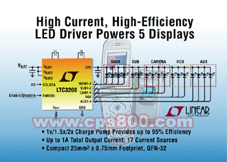 LTC3208 范圍為 2.9V 至 4.5V 的輸入電壓為單節鋰離子蜂窩應用而優化。當用鋰離子電池(標稱值為 3.6V)驅動時,效率達到 95%,同時靜態電流僅為 250uA,從而最大限度地延長了電池工作時間。LTC3208 僅需要 4 個小型的電容器和一個電阻,就可組成占板面積微小的低矮(< 34mm2,高 0.75mm)解決方案,能為 5 個獨立顯示屏使用的所有 LED 供電。