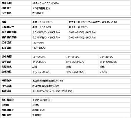 該產(chǎn)品采用衛(wèi)生型的壓阻式OEM壓力傳感器作為信號測量元件,并經(jīng)過計算機(jī)自動測試,用激光調(diào)阻工藝進(jìn)行了寬溫度范圍的零點和靈敏度溫度補(bǔ)償。放大電路位于不銹鋼殼體內(nèi),將傳感器信號轉(zhuǎn)換為標(biāo)準(zhǔn)輸出信號。整個產(chǎn)品經(jīng)過了傳感器、元器件、半成品及成品的嚴(yán)格測試及老化篩選,性能穩(wěn)定可靠。