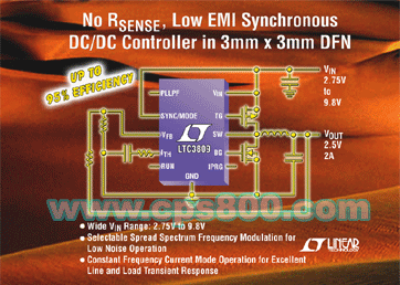 8月16日北京訊,凌特公司(Linear Technology)推出采用3mmx3mmDFN-10和MSOP-10封裝以及具擴頻調制技術的同步降壓型控制器 LTC3809。該器件以恒定頻率工作,采用具有 MOSFET VDS 檢測功能的電流模式架構無需電流檢測電阻,同時具有高達 95% 的效率。LTC3809 的輸入電壓范圍為 2.75V 至 9.8V,非常適用于單節或雙節鋰離子或多節鎳氫/鎳鎘/堿性電池應用以及標準 3.3V 和 5V 輸入。LTC3809 可以設置成突發模式(Burst ModeÒ)工作,此時靜態電流僅為 100uA。