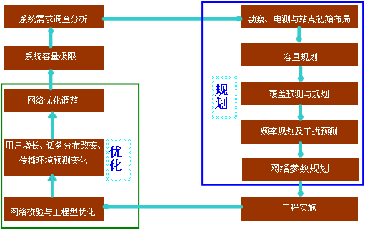網(wǎng)絡(luò)開通正常運營了一段時間后,用戶增加、城區(qū)環(huán)境變化等動態(tài)不可控因素的影響,覆蓋區(qū)域內(nèi)會出現(xiàn)局部信號變?nèi)酢⒑艚谐晒β式档汀⑼ㄔ捹|(zhì)量下降等情況,對于系統(tǒng)全局也會發(fā)生話務(wù)負荷不均衡和性能統(tǒng)計指標偏低等現(xiàn)象,原來規(guī)劃建設(shè)的網(wǎng)絡(luò)已經(jīng)不能滿足需求。對系統(tǒng)資源配置和相關(guān)參數(shù)特性進行調(diào)整或擴充,這就是無線網(wǎng)絡(luò)優(yōu)化。圖1中左半部分所指示的就是網(wǎng)絡(luò)優(yōu)化在無線網(wǎng)絡(luò)建設(shè)中所處的環(huán)節(jié)。