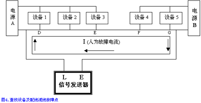 信號發(fā)送器輸出可施加于混線電源兩端DG之間.人為故障電流一定而且必須經(jīng)過混線點(diǎn).用信號接收器按圖對單根配線進(jìn)行接收,對每根有電平指示的配線,根據(jù)設(shè)備配線圖確認(rèn)屬于那個(gè)電源的線點(diǎn),這樣,兩電源線點(diǎn)E與F的交分處C即為設(shè)備及配線混線故障點(diǎn).