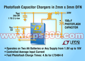 2005年9月19日北京訊,凌特公司(Linear Technology)推出 LT3484 系列高效率、超快、照相閃光燈電容(典型值為 320V)充電器。這些集成電路設計成獨立器件,無需通常與其他照相閃光燈充電器解決方案有關的微處理器負載和大量軟件開發。